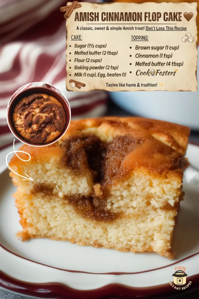 There’s something wonderfully nostalgic about a recipe that doesn’t try to be perfect—and Amish Cinnamon Flop Cake is exactly that kind of dessert. It’s simple, soft, slightly sunken in the middle, and built around the idea that the “flop” is the best part. In Amish kitchens, this cake shows up when unexpected guests arrive or when there isn’t time to fuss with fancy layers or complicated frostings. It’s the definition of comfort baking: a handful of pantry staples, one bowl for the batter, one bowl for the topping, and a short bake time that makes the whole house smell warm and sweet.