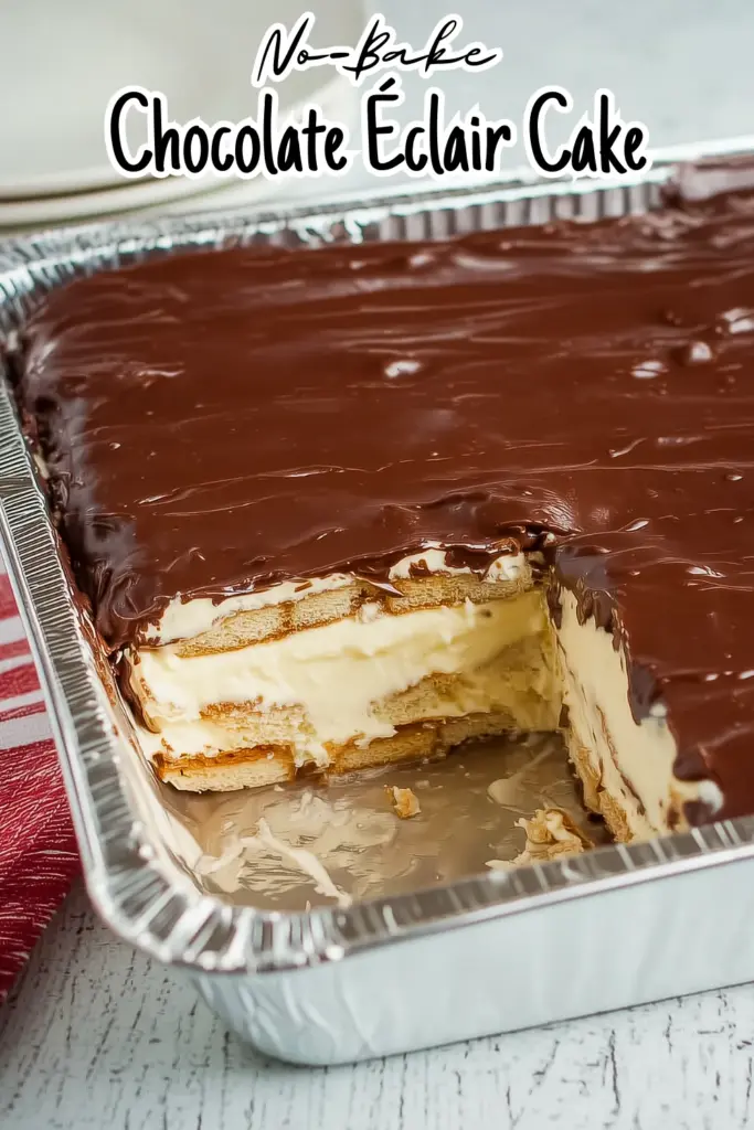 Banana Eclair Cake: Slice two bananas and layer them between the pudding and graham crackers. The banana adds a fresh element that pairs really well with the chocolate, and it makes each slice feel a bit more substantial.