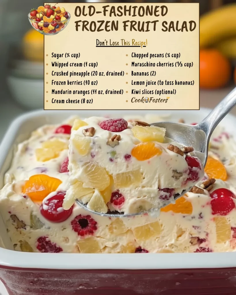 One reason this recipe succeeds is the balance of fruit textures and flavors. Crushed pineapple adds moisture and sweetness, but it must be drained well so the salad doesn’t freeze icy. Frozen strawberries or raspberries provide color and light tartness. Mandarin oranges bring citrus brightness. Cherries add sweetness and nostalgia. Bananas soften into the cream and round everything out.