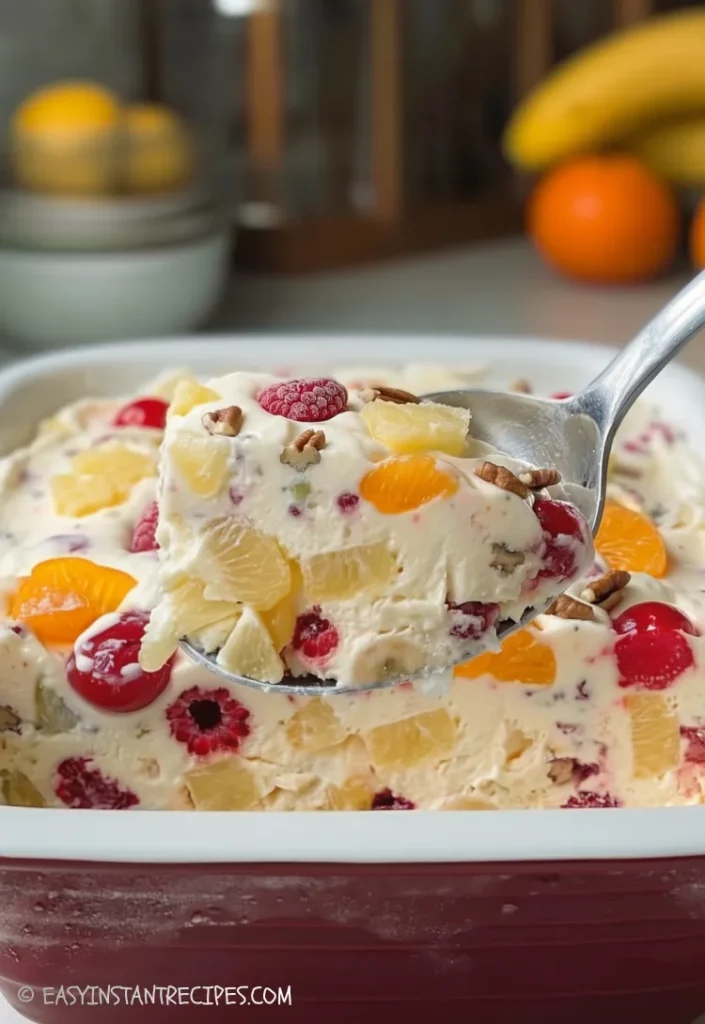 It showed up at church potlucks. It lived in the freezer during holidays. It waited patiently until someone said, “Don’t forget the fruit salad,” right before guests arrived. Cold, creamy, lightly sweet, and packed with colorful fruit, this dessert feels old-fashioned in the best way. Not trendy. Not complicated. Just dependable and comforting.