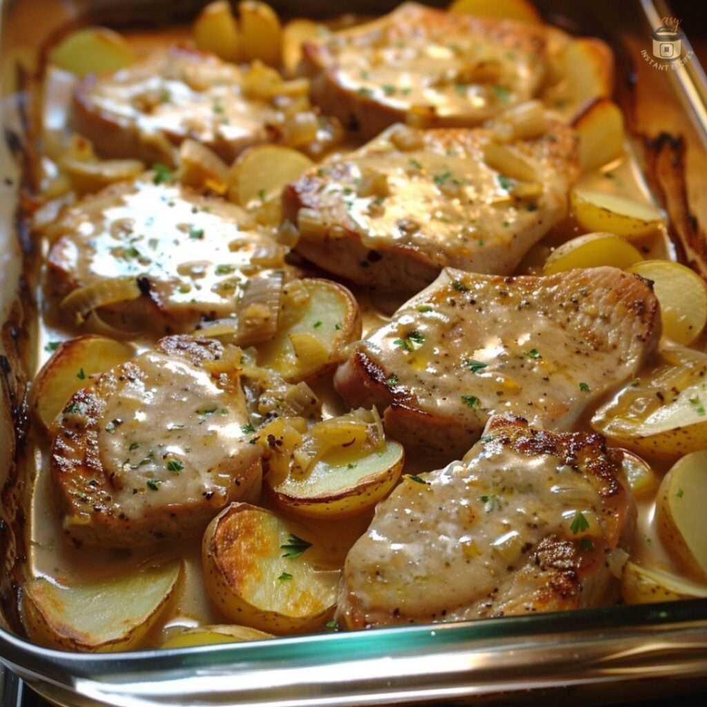 On top of the potatoes, put the pork chops that have been browned.